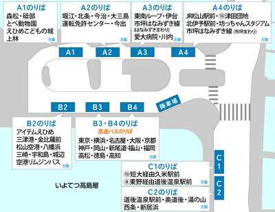 2024年09月27日(金) 松山線 松山市駅前バスのりばの変更について(2024年10月15日~) 岡山~松山線 松山市駅前広場整備に伴い、松山市駅前バスのりば及びのりば番号が変更になります。 ご注意いただきますようお願いいたします。 変更日 2024年10月15日(火) 変更内容 ①②のりば → B3、B4のりば 松山市駅前広場整備について詳細はこちら >>松山市HP 2024年10月15日からののりばは下記のとおり