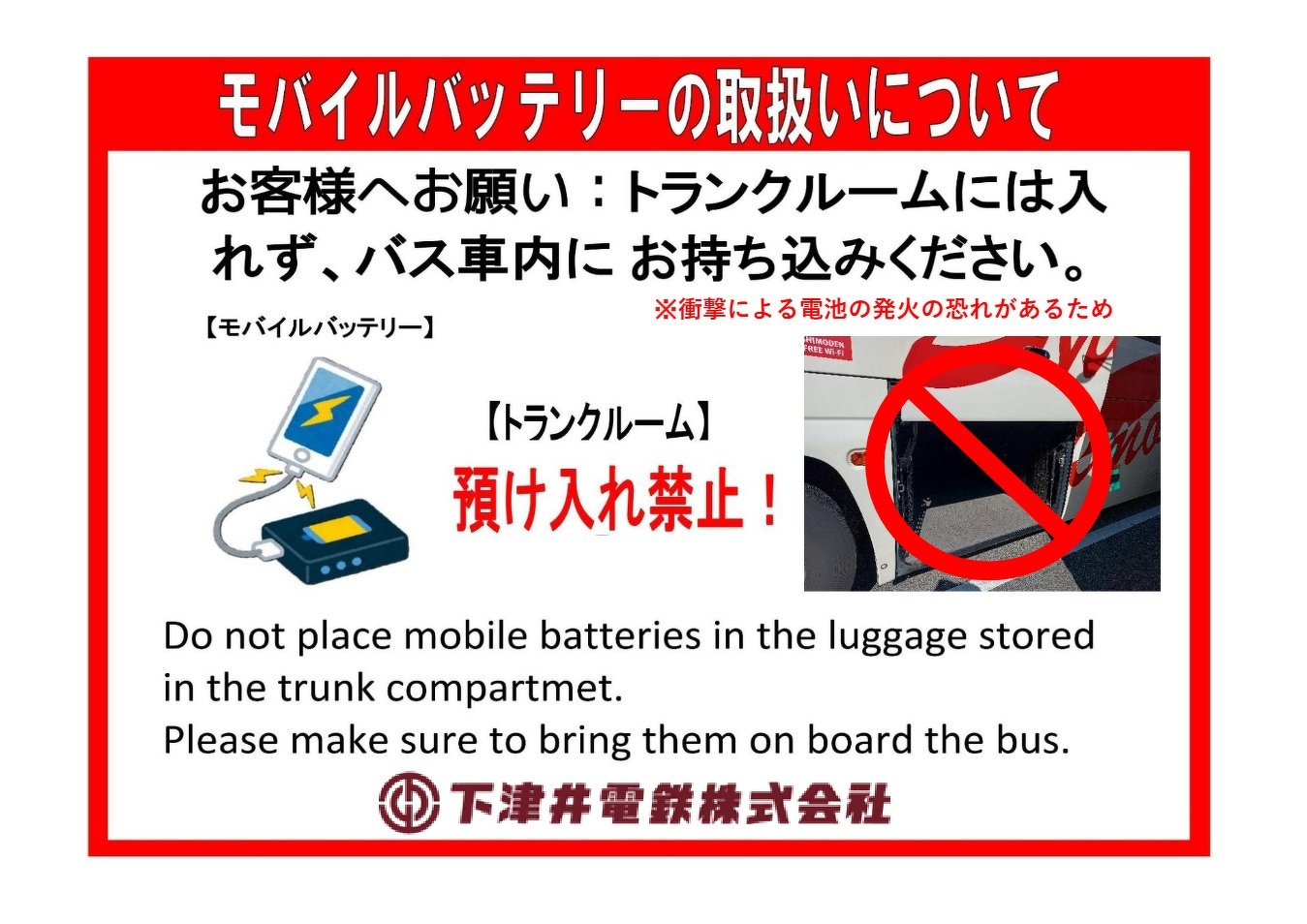 2025年11月04日(火) 全路線 モバイルバッテリーのトランク預入れの禁止について モバイルバッテリー等(携帯型充電器)に使用されているリチウムイオン電池は、衝撃や損傷等により発火、火災に至る恐れがあり、お客様や社員の安全を確保するため、トランクルームではお預かりできません。 必ず持ち込み手荷物としてバス車内へお持ちください。 安全運行の為、何卒ご協力をお願いいたします。 実施内容: モバイルバッテリーのトランク預入れの禁止 実施日 : 令和7年11月10日(月)より