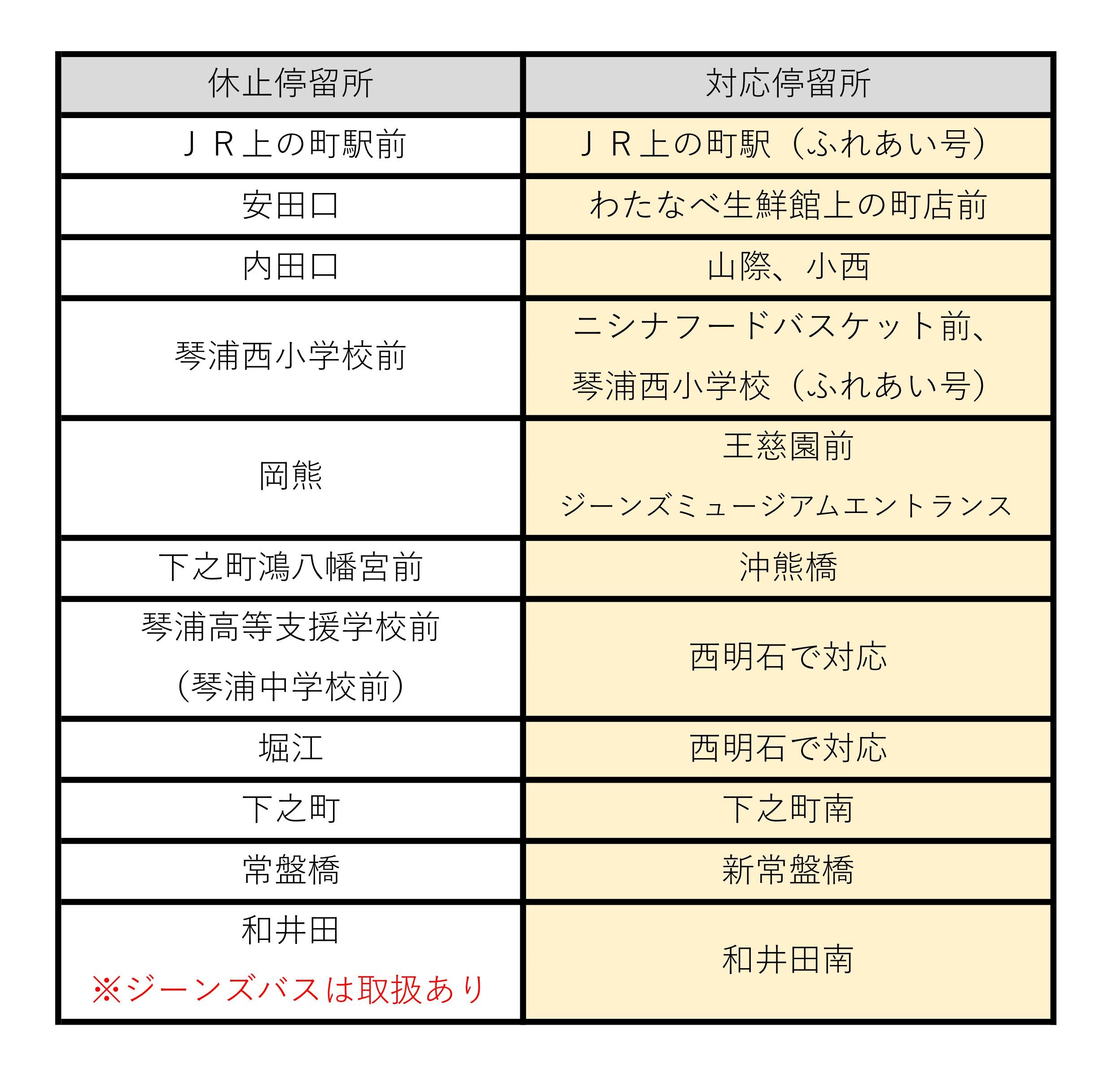 2025年10月10日(金) 2025年10月12日 下之町鴻八幡宮(秋祭り)に伴う替道運行について 下之町鴻八幡宮(秋祭り)に伴う下之町地内車両通行止め規制の為、関係する路線について下記のとおりの運行となります。ご注意ください。 変更日 :2025年10月12日(日) 規制時間 8:00~19:00まで 対象路線:興除線、王子ヶ岳線(宇野駅行含む)、ジーンズバス 変更内容:下之町地内を全便迂回にて運行します。迂回区間のバス停はご利用頂けません。 替道にて対応するバス停をご利用ください。 ※休止停留所及び替道運行に伴う対応停留所は下記のとおり