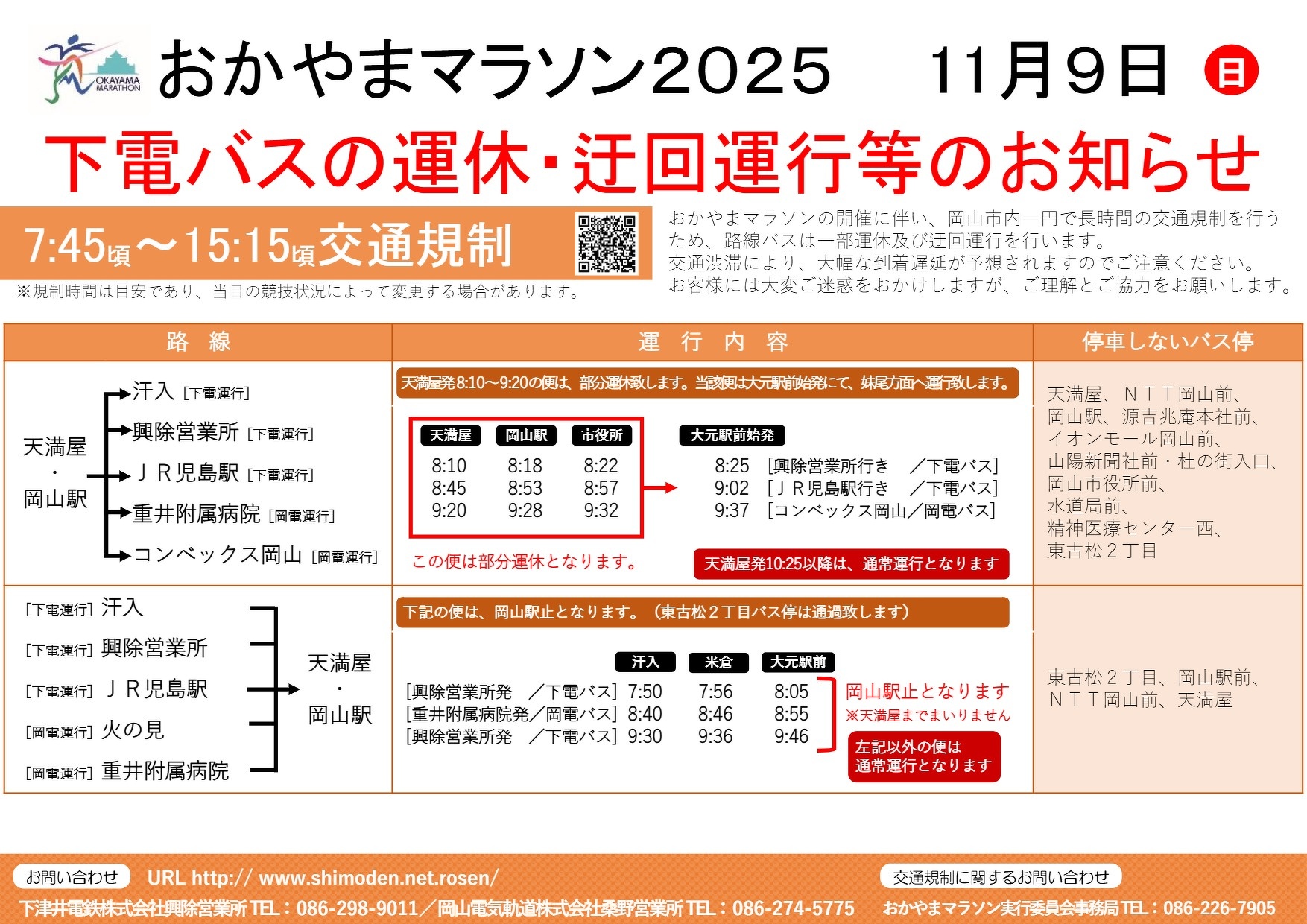 2025年10月29日(水) おかやまマラソン開催に伴う路線バスの運行について おかやまマラソン開催に伴う路線バスの運行について 2025年11月9日(日)おかやまマラソン開催に伴い、路線バスの運行が一部変更になります。 お客様には大変ご迷惑をお掛けいたしますが、ご理解とご協力をお願いいたします。 対象日:2025年11月9日(日) 対象路線:興除線 変更内容:下記を参照ください。※始発地の変更、停留所休止などがございます。